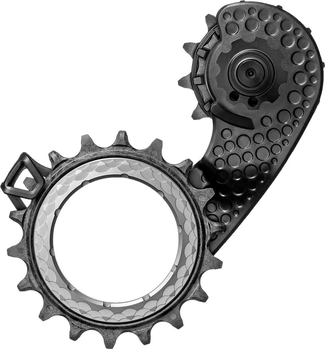 HOLLOWcage® for Shimano Ultegra 8100 12spd. The revolutionary mono-plate OSPW design is the quietest and best shifting, oversized derailleur cage for Shimano 12spd created to date. HOLLOWcage ® OSPW has a carbon-polymer mono-plate construction with bespoke, oversized, full ceramic bearings and the most advanced silencing pulleys ever made.