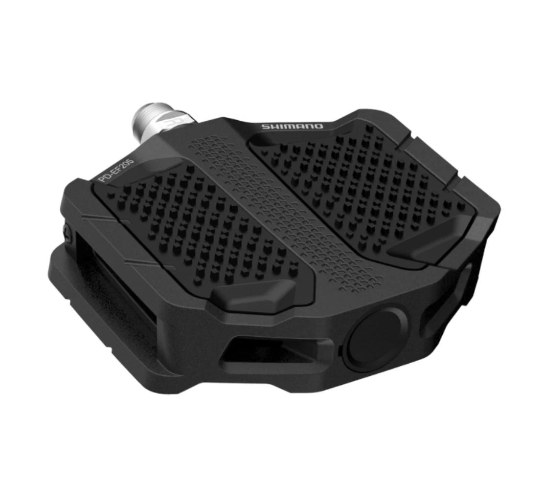 SHIMANO’s PD-EF205 flat pedals deliver stability and comfort for commuting and urban riding. Designed for use with formal footwear, these pedals offer a solid pedal-shoe interface, textured surface, and a wide aluminium platform for confidence and control in any riding condition.