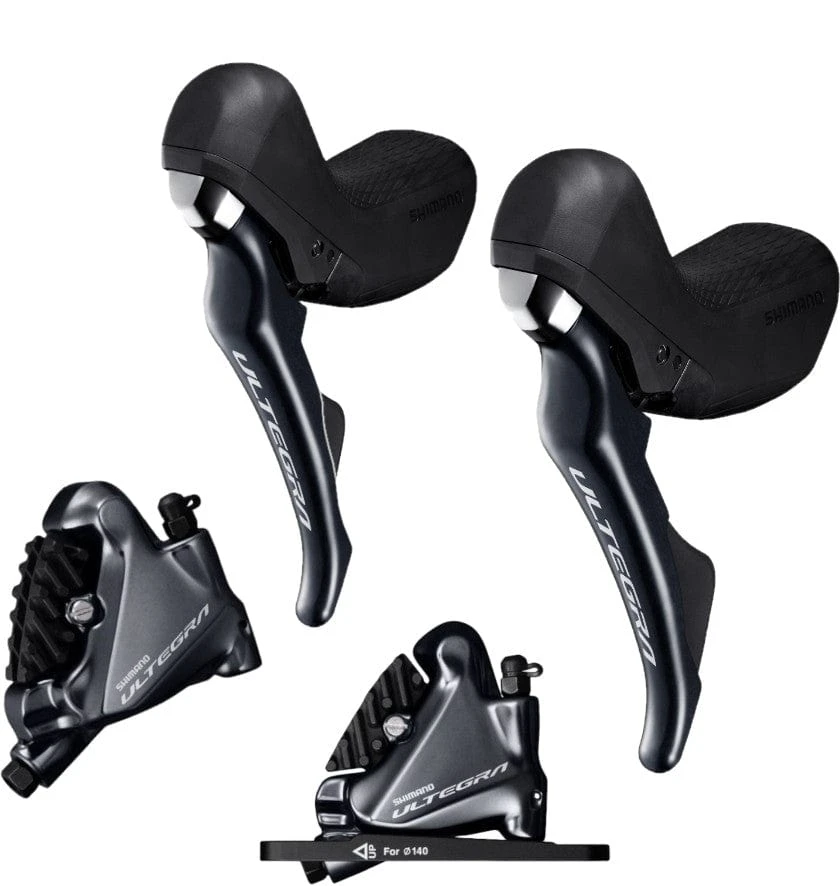The Shimano ST-R8020 Ultegra STI shift/brake lever set combines efficient shifting and powerful hydraulic braking, making it a popular choice for cyclists seeking high-performance components for various road riding disciplines. The BR-R8070 hydraulic disc brake calipers provide reliable and consistent stopping power, while the STI levers offer comfortable reach adjustment and smooth shifting performance.